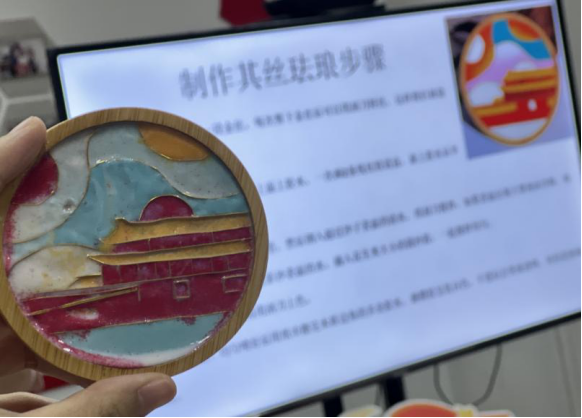 活动现场,职工群众们全心投入,先用金丝在画板上细致地勾勒出图案轮廓。这看似简单的“掐丝”步骤,却极其考验耐心和巧劲,需要将细如发丝的金线弯曲、粘合,构成流畅的线条。随后,进入最富有趣味的“点蓝”环节,大家化身“调色师”,用特制的釉料小铲,小心翼翼地将五彩斑斓的彩砂填充到金丝构成的格挡中。一抹抹瑰丽的蓝、喜庆的红、璀璨的金在指尖绽放,原本单调的底板渐渐变得生动饱满,一幅幅充满中秋韵味的小画跃然板上。
